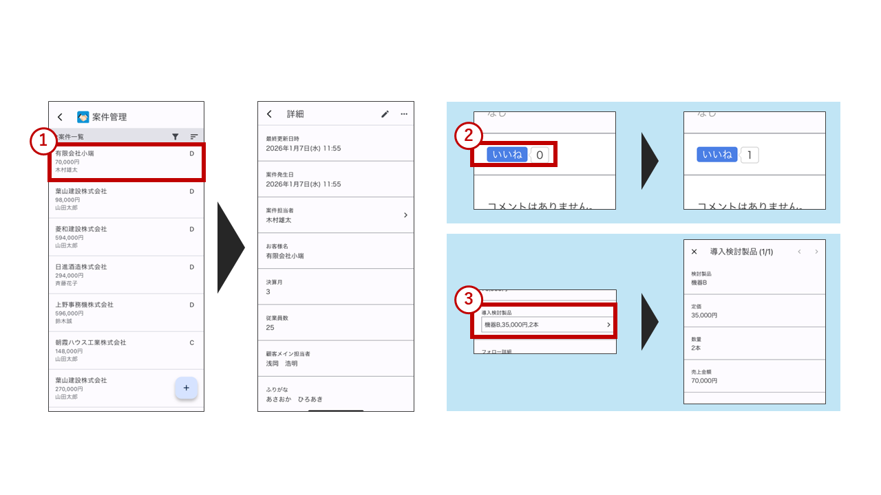 ①確認したいデータをタップすると詳細画面が開きます。