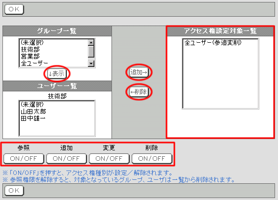アクセス権の各種別を設定するには、アクセス権設定対象一覧から対象を選択し、各種別の を押します。 解除する場合はもう一度同じ操作を行ってください。