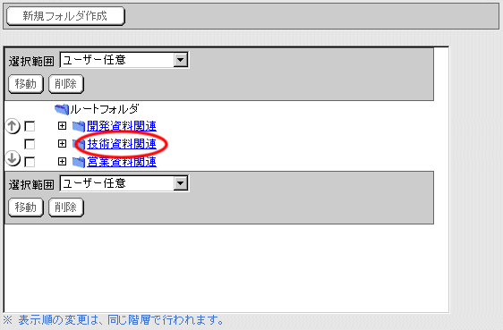 フォルダ管理一覧画面の[選択範囲]欄より移動したいフォルダを選択してください。