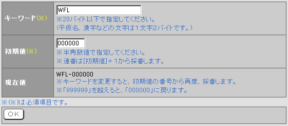 連番の発行時に使用する「キーワード」、「初期値」の値を入力します。