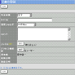 作業状態 "完了"を選択した場合、登録後の文書は、閲覧可能な状態となります。"更新作業中"を選択した場合は、更新作業中の状態になり、ファイルがロックされます。