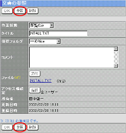 作業状態が”更新作業中”の文書を参照すると、作業者の氏名と、グループが表示されます。