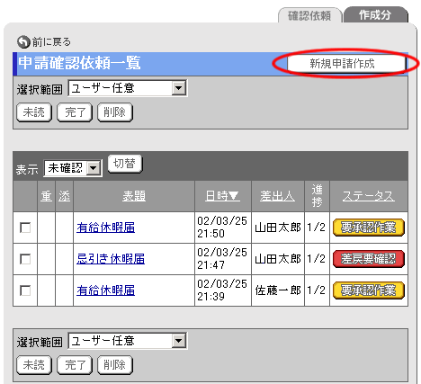 申請確認依頼一覧、申請作成一覧にある「新規申請作成」ボタンを押します。