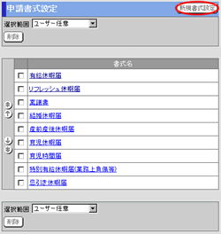 申請書式一覧画面の[選択範囲]欄より、削除したい書式を選択します。