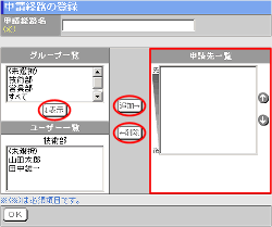 申請先の対象ユーザーを[グループ一覧]、[ユーザー一覧]から選択して[申請先一覧]に設定します。