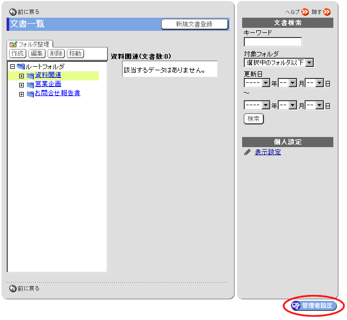 文書管理画面の右下にある「管理者設定」ボタンを押します。