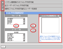 フォルダ作成権限の対象ユーザーを[グループ一覧]、[ユーザー一覧]から選択して[フォルダ作成権限設定一覧]に設定します。