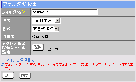 ※アクセス権変更確認画面を表示するのは、旧フォルダ情報のアクセス権と比較して変更があり、更新する必要のある子フォルダ、文書が存在する場合とします。
