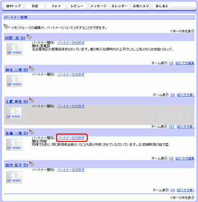 友人管理一覧画面、紹介文の作成と編集・削除、友人から外す、関係の追加・削除を行うことが可能です。