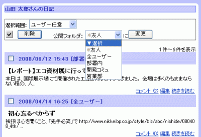 1.日記一覧画面から、選択範囲で変更対象の日記を設定し、公開フォルダを選択してください。