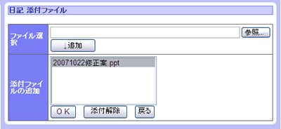 1.日記作成画面で[添付]ボタンをクリックすると、添付ファイル追加画面が表示されます。