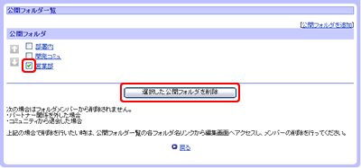 1.公開フォルダ一覧画面で削除したい公開フォルダにチェックを入れ、[選択した公開フォルダを削除]ボタンをクリックしてください。