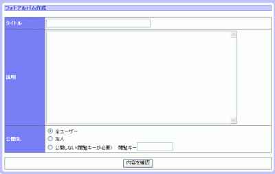 | タイトル | フォトアルバムのタイトルを入力してください。