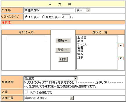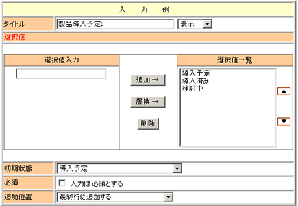 初期状態欄のリストボックスに選択値一覧に設定されている値が表示されるため、デフォルトで選択したい値を設定してください。