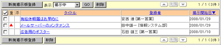 一覧に表示する掲示板は、表示のプルダウン(掲示開始前、掲示中、掲示終了、すべて)によって変えることができます。
